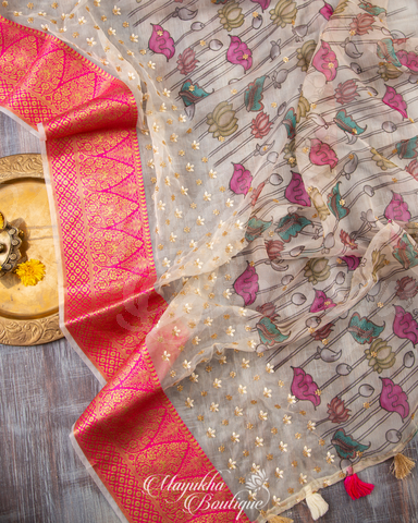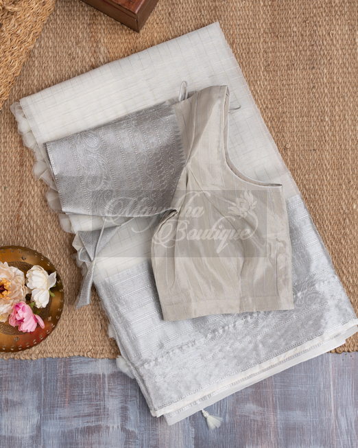 Banarasi Kora Off White Saree With Stitched Blouse In Size 38-44