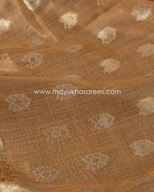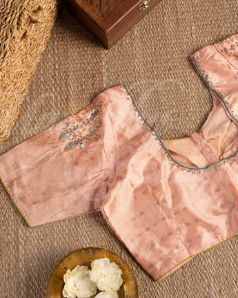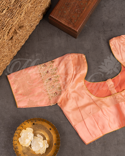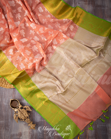 Banarasi Kora Peach & Green Saree With Stitched Blouse In Size 38-44