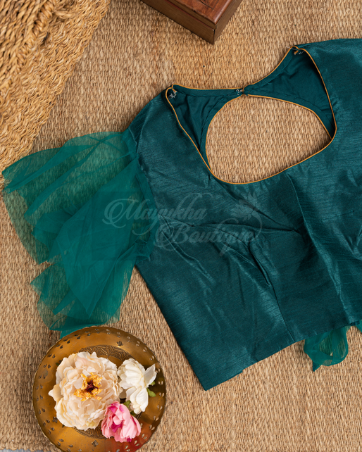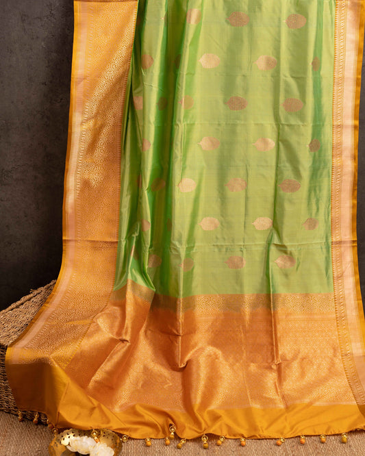 Banarasi Katan The Nature Green And Mustardsaree With Stitched Blouse In Size 38-44