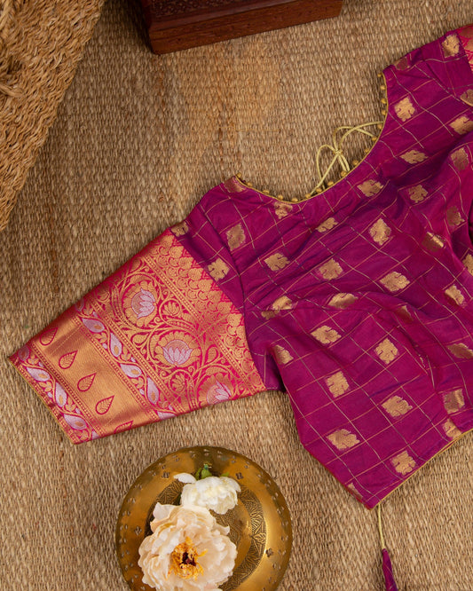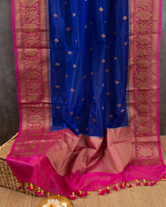 Banarasi Kora Ink Blue & Magenta Lost In Blues Saree With Stitched Blouse In Size 38-44