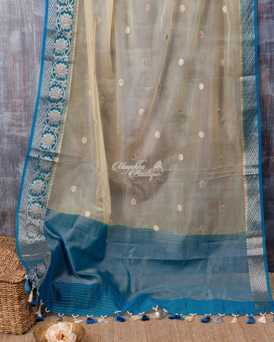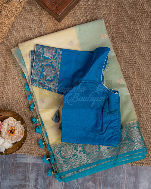 Banarasi Kora Beige & Ocean Blue Yellow-Blue Glitz Saree With Stitched Blouse In Size 38-44