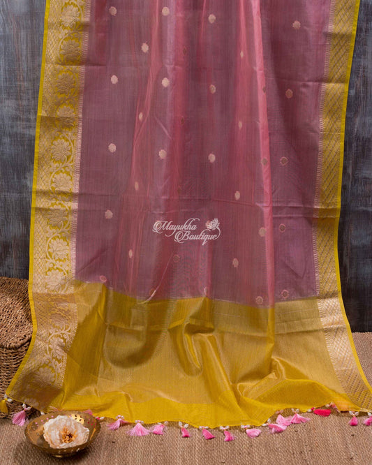Banarasi Kora Powder Pink & Yellow Pink Magnificence Saree With Stitched Blouse In Size 38-44