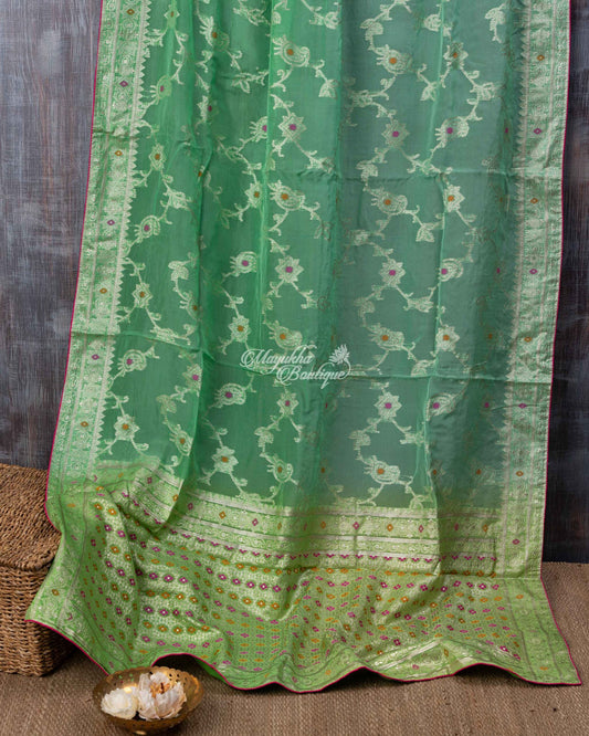 Banarasi Kora With Jaal Work Light Green Basil Meadows Saree With Stitched Blouse In Size 38-44