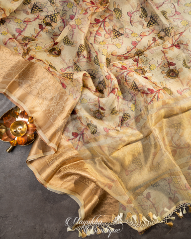 Banarasi Kora Pure Silk Kalamkari Prints Beige & Green Saree With Stitched Blouse In Size 38-44