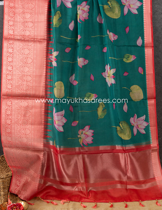 Teal & Red Light weight Lotus Printed Kota silk sarees with Banarasi Borders and Floral Printed Blouse in Size 38 44