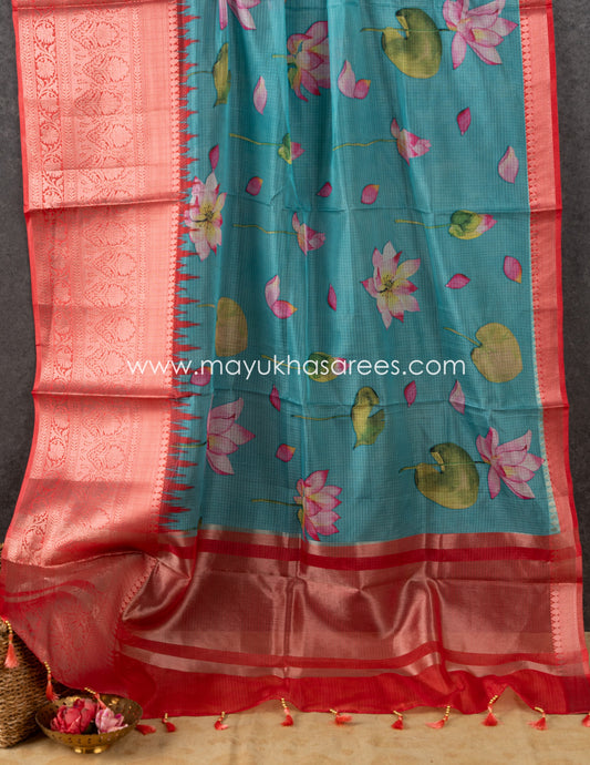 Teal and Red Light weight Lotus Printed Kota silk sarees with Banarasi Borders and Floral Printed Blouse in Size 38 44