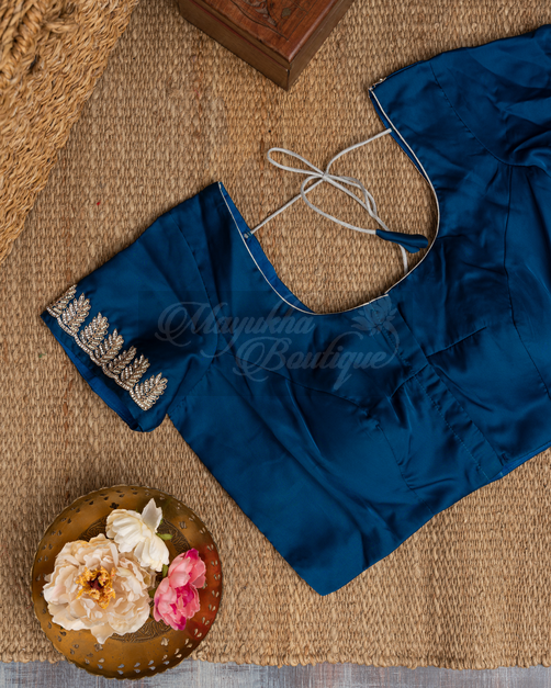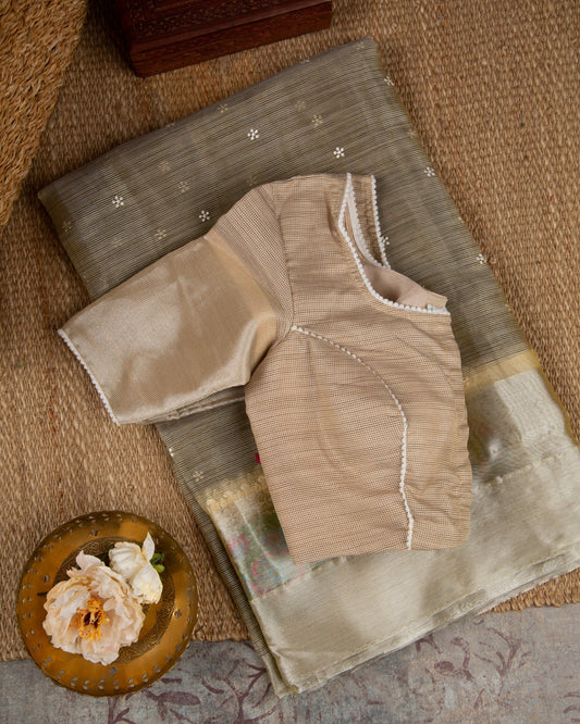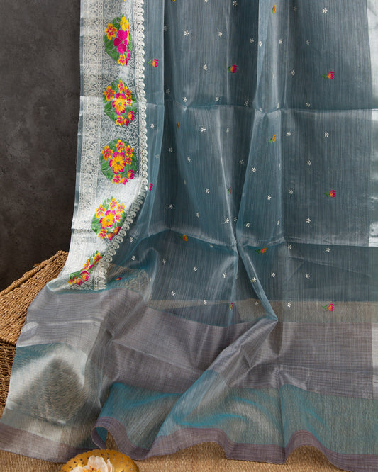 Tissue Linen With Machine Embroidery Teal & Gray Ocean Echos Saree With Stitched Blouse In Size 38-44