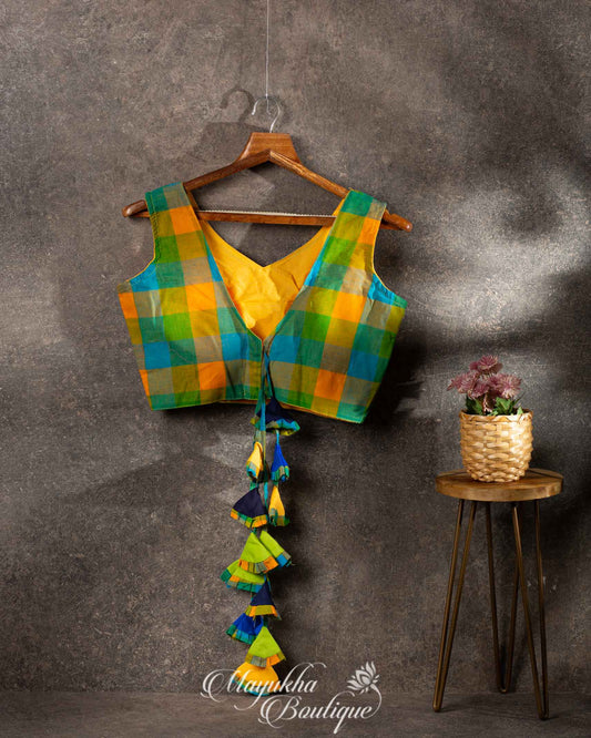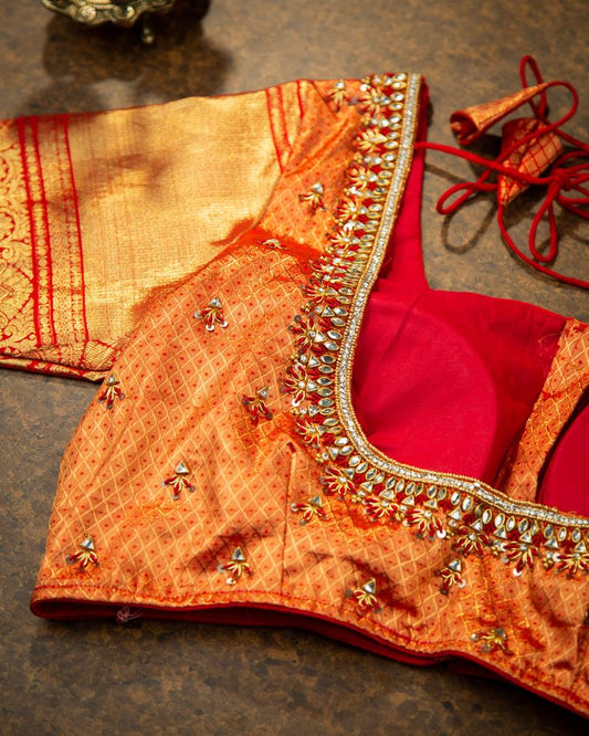 Tissue Linen Mustard With Red Sunshine Saree With Stitched Blouse In Size 38-44