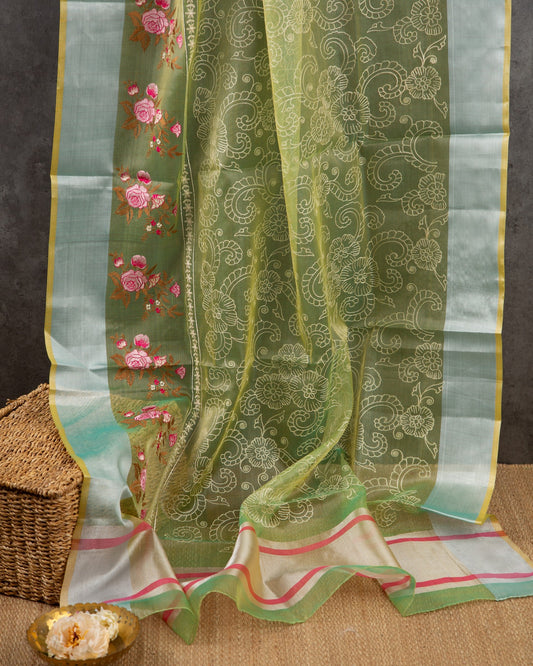 Tissue Linen Green & Red Ethreal Gorgeosness Saree With Stitched Blouse In Size 38-44