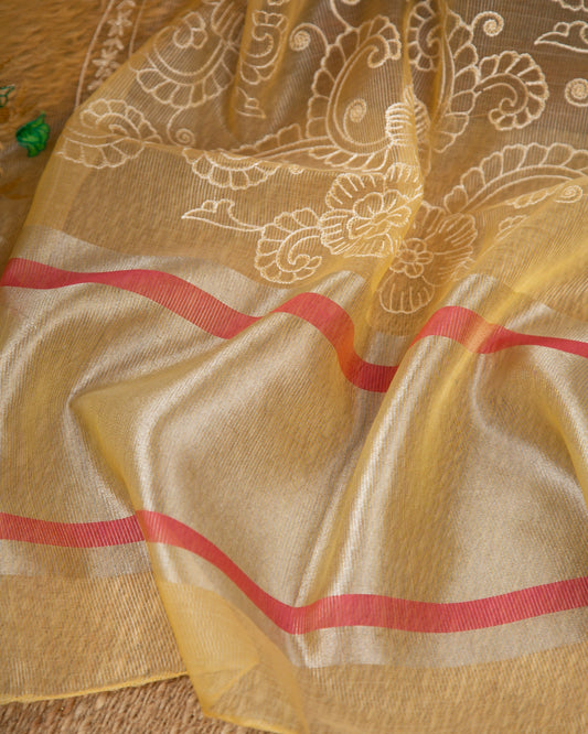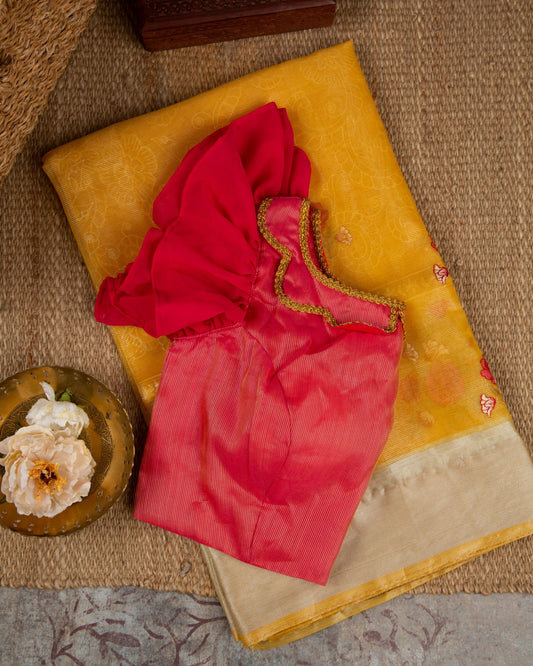 Tissue Linen With Machine Embroidery Yellow With Red Dancing Dawn Saree With Stitched Blouse In Size 38-44
