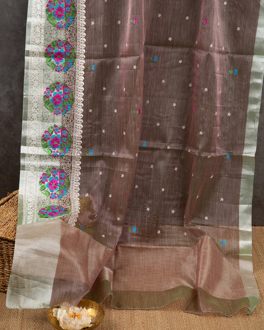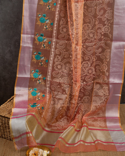 Tissue Linen With Chikankari Embroidery Brown & Mauve Breaking Waves Saree With Stitched Blouse In Size 38-44