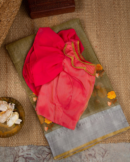 Tissue Linen Snuff With Red Down To Earth Saree With Stitched Blouse In Size 38-44