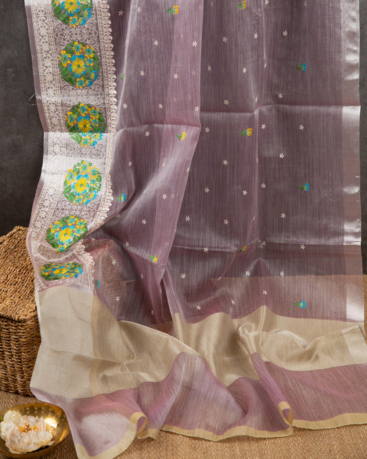 Tissue Linen With Machine Embroidery Mauve Charismatic Haven Saree With Stitched Blouse In Size 38-44