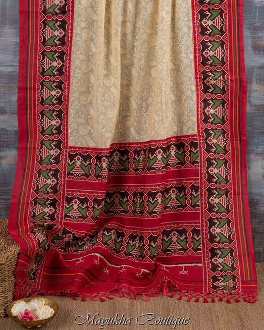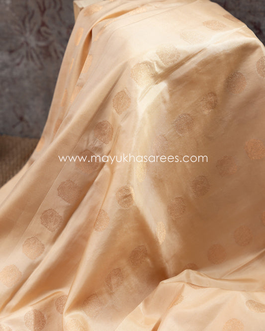 Beige and Red Lotus Printed Semi Kanchipuram with Gap borders and Stitched Blouse in Size 38-44