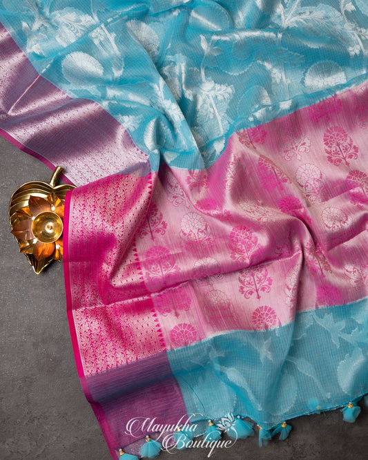 Blue Banarasi Kora Semi Silk Saree with All over Woven Butties and Tifli Borders in Magenta | Blouse Size 38-44 | Free Shipping