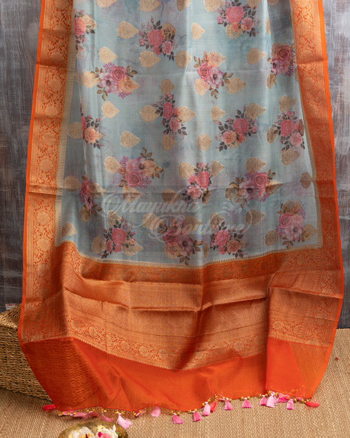 Blue Banrasi Kora Floral Printed Saree