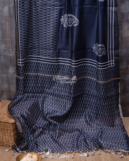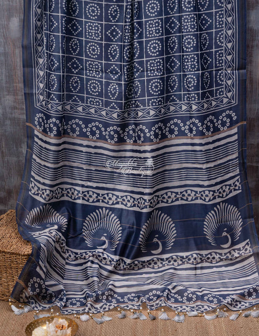 Chanderi Blend Hand Block Print Grey Elite Blue Saree With Stitched Blouse In Size 38-44