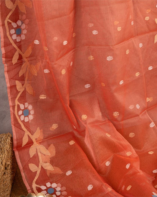 Brick Red Pure Muslin Silk Saree with Handwoven Jamdhani Floral Patterns & Blue Machine Embroidered Blouse | Blouse Size 38-44” | Free Shipping