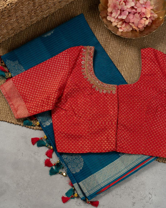 Peacock Blue Striped Kanchipuram Kora Silk Saree with Red Banarasi Brocade hand Embroidered Blouse | Blouse Size 38-44 | Free Shipping