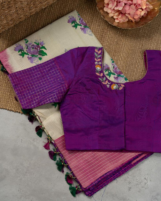 Unique Lilac Printed Gadwal Silk Saree in Off-white with Purple Color Handwork Blouse | Blouse Size 38-44 | Free Shipping