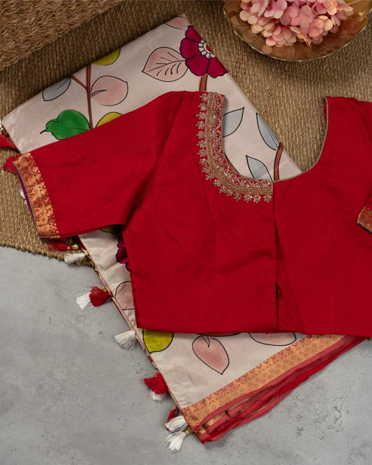 Hand Painted Kalamkari on Offwhite Pure Kanchipuram Silk saree with Red Borders and Red Hand Embroidered Blouse | Blouse Size 38-44” | Free Shipping