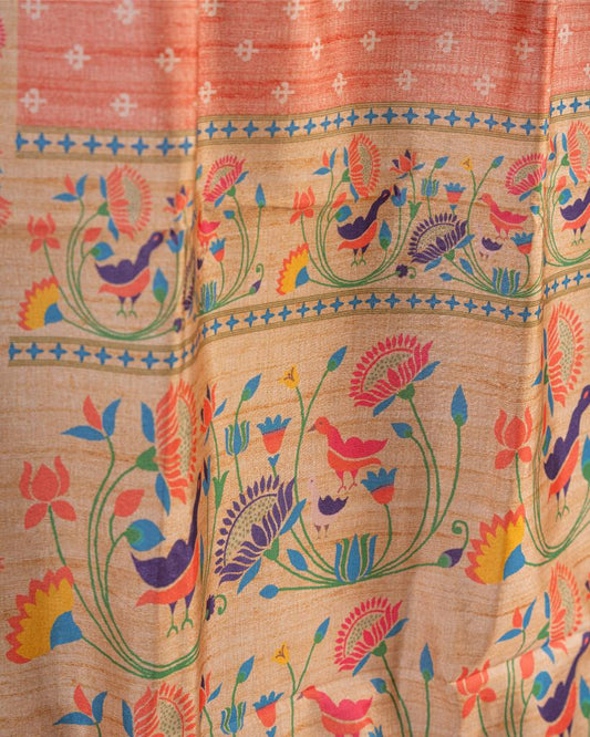 Peach Semi Tassar Silk Saree with Paithani Brocade printed Borders & Pallu | Blouse Size 38-44” | Free Shipping