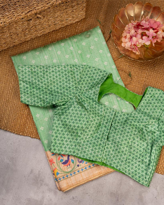 Pastel Green Semi Tassar Silk Saree with Paithani Brocade printed Borders & Pallu | Blouse Size 38-44” | Free Shipping
