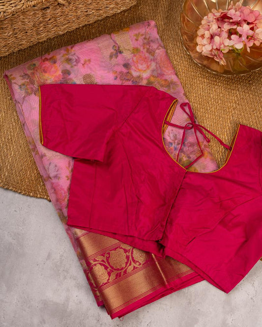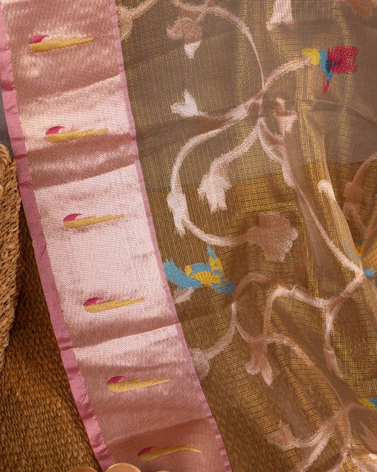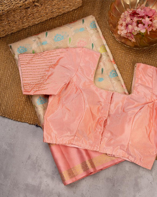 Floral Prints on Pastel Peach Banarasi Kora Silk Saree | Blouse Size 38-44” | Free Shipping