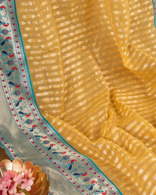 Paithani Brocade pattern weaving on Mustard Semi Chanderi Silk Saree with Silver Borders & with Aqua Patterned Blouse | Blouse Size 38-44” | Free Shipping