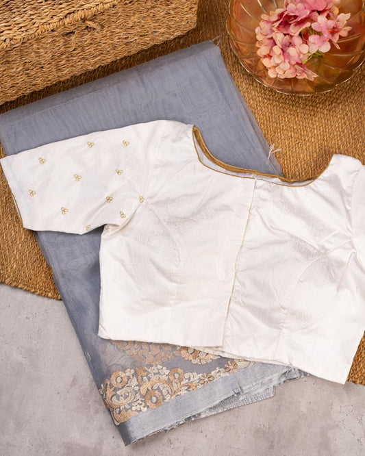 Grey Pure Organza Silk with Paisley embroidery and White Hand Embroidered Blouse | Blouse Size 38-44” | Free Shipping