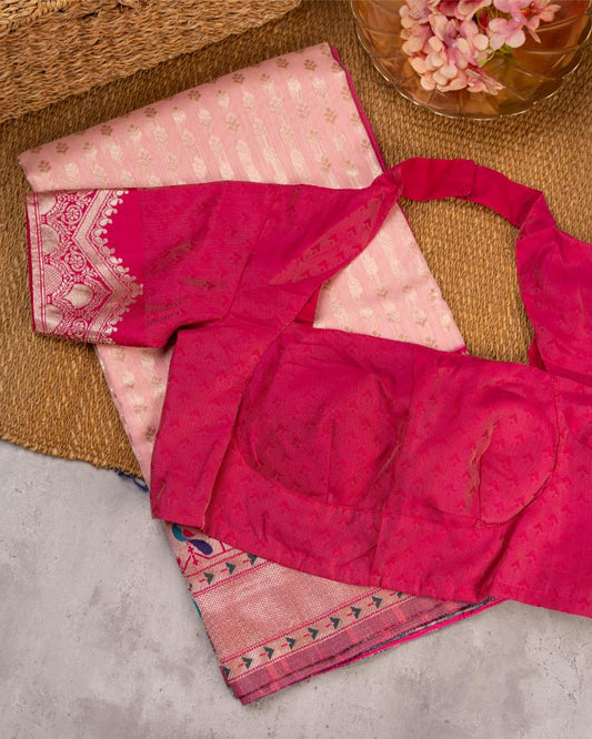 Baby Pink Paithani Brocade pattern weaving Semi Chanderi Silk Saree with Silver Borders & with Magenta Patterned Blouse | Blouse Size 38-44 | Free Shipping