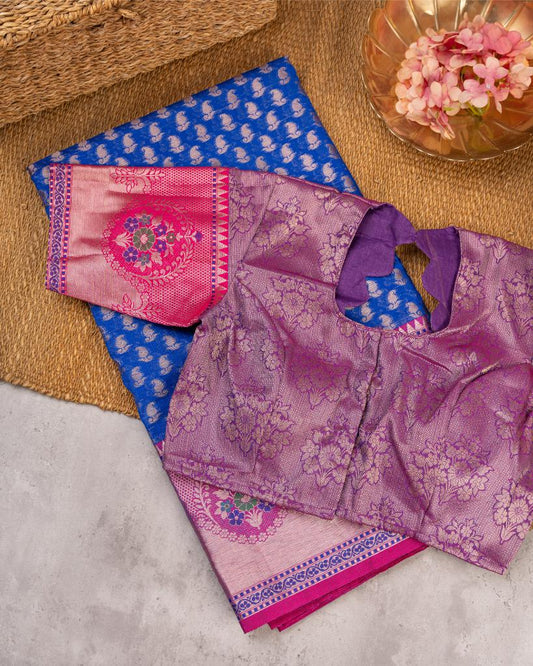 Blue Banarasi Kora Semi Silk Saree with All over Woven Butties and Tifli Borders in Magenta | Blouse Size 38-44 | Free Shipping