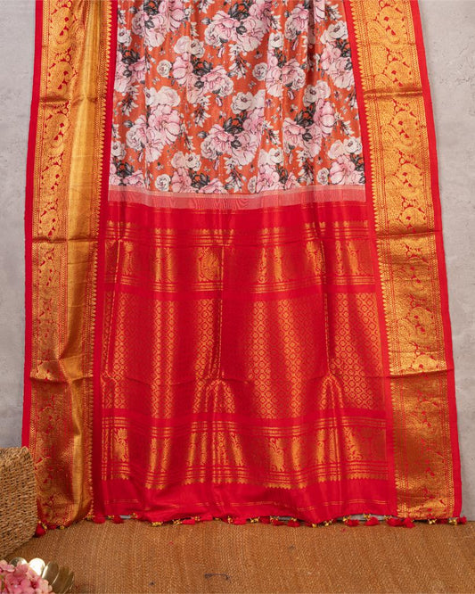 Exclusive Designer Floral Prints on Peach Gadwal Silk Saree with Intricately Woven Peacock Borders in Red & Zardosi Embroidered Blouse | Blouse Size 38-44 | Free Shipping