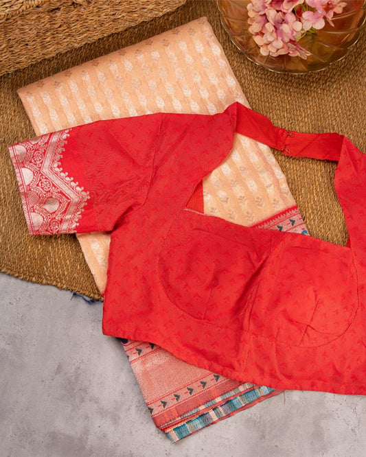 Paithani Brocade pattern weaving on Peach Semi Chanderi Silk Saree with Silver Borders & with Red Patterned Blouse | Blouse Size 38-44 | Free Shipping