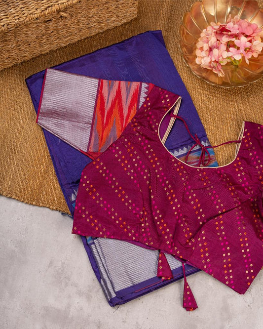 Purple and Maroon Mangalagiri Silk Saree with Ikkat Weave in the Border with Silver Zari and Maroon Bandini woven Blouse | Blouse Size 38-44 | Free Shipping