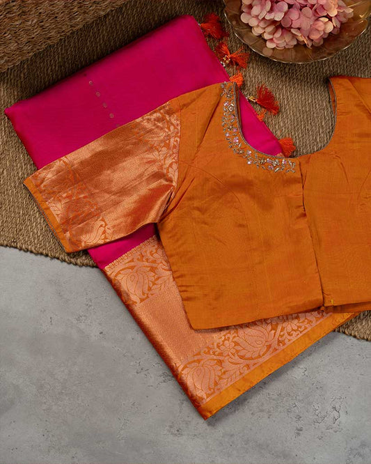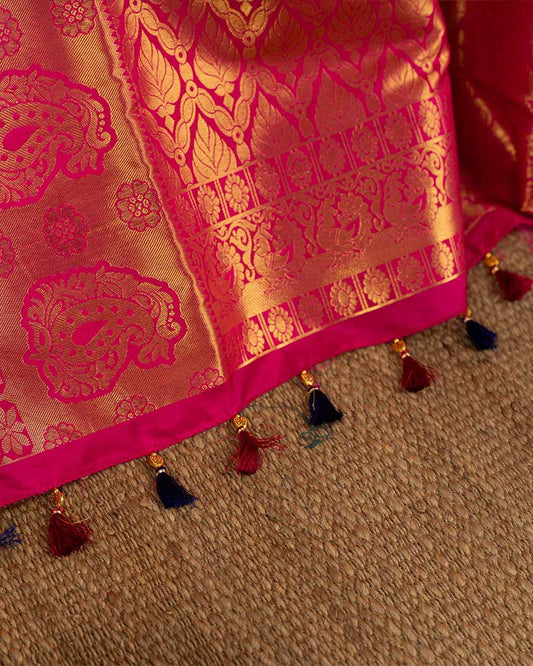 Magenta Pink Kanchipuram Silk Saree with 1000 Butties and Mustard Handwork Blouse | Blouse Size 38-44” | Free Shipping