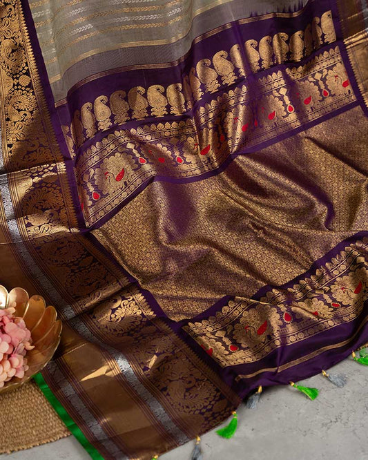 Snuff Brocade Gadwal Silk saree with Purple and Green Salvage Border with Handwork Purple Blouse | Blouse Size 38-44” | Free Shipping
