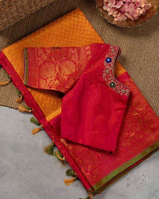 Golden Yellow Brocade Gadwal Silk Saree with Red Handwork Blouse | Blouse Size 38-44” | Free Shipping