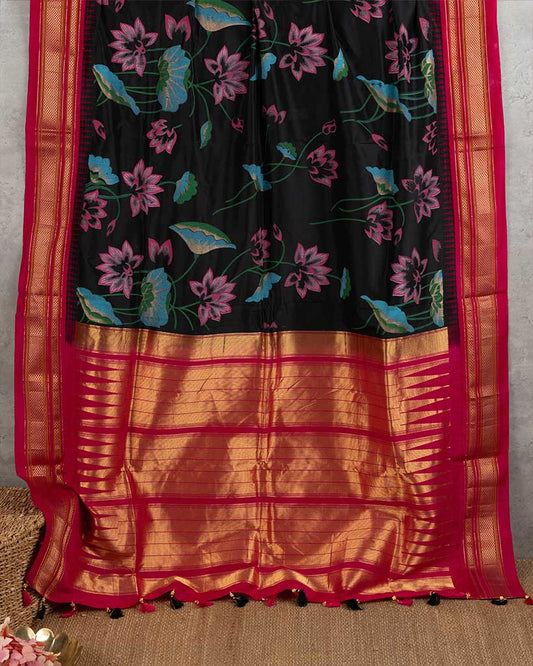 Pichwai Printed Black Irkal Silk Saree with PinkBorders and Pearl Embroidered Pink Blouse | Blouse Size 38-44 | Free Shipping
