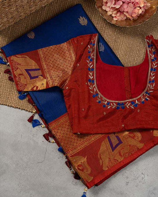 Blue Gadwal Silk Saree with Intricate Elephant Woven Borders, Rudraksha & Peacock woven pallu and Rust color Hand embroidered Blouse | Blouse Size 38-44 | Free Shipping