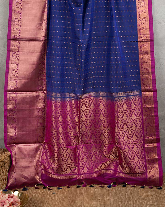 Royal Blue and Purple Kanchipuram Silk Saree with 1000 Butties motiffs and Handwork Blouse | Blouse Size 38-44 | Free Shipping