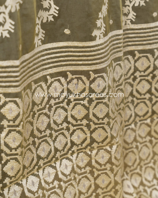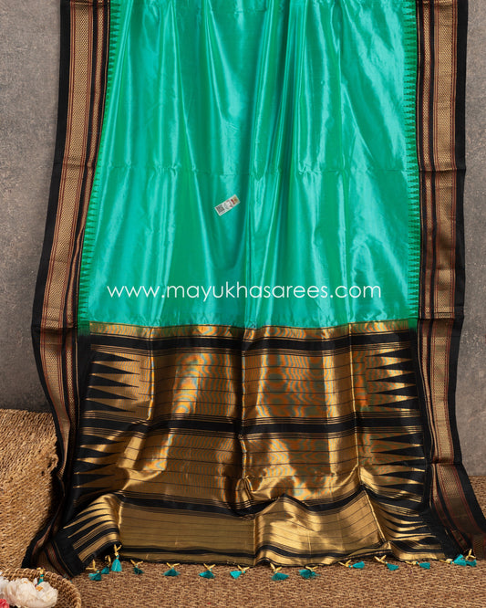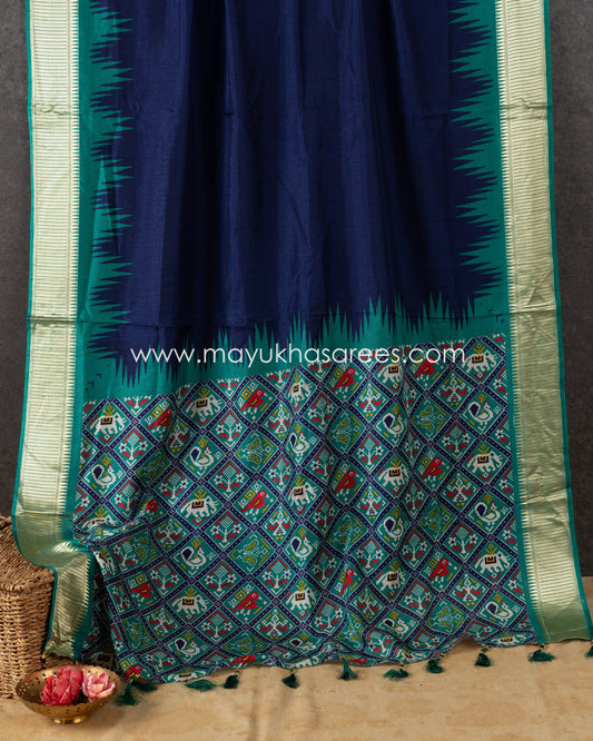 Navy Blue & Green Patola Prints on Munga Silk Saree with Temple Design Borders and Stitched Blouse in Size 38 44