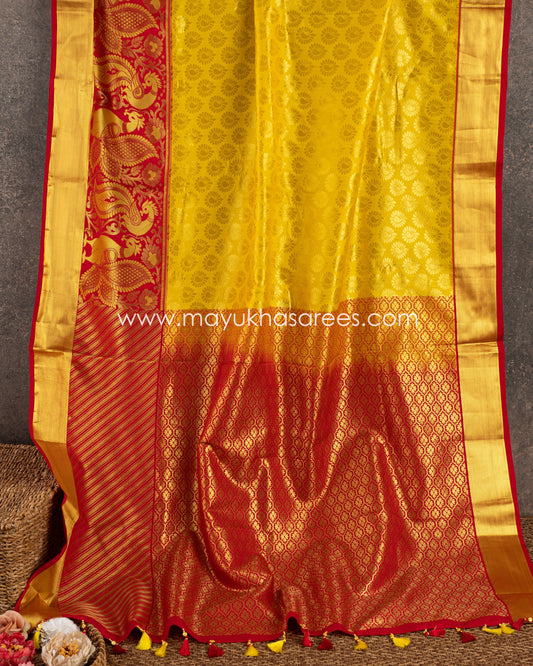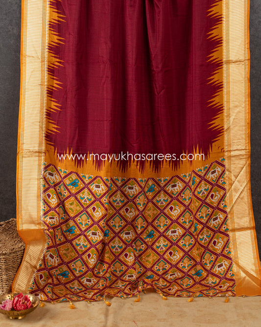 Mustard & Maroon Patola Prints on Munga Silk Saree with Temple Design Borders and Stitched Blouse in Size 38 44