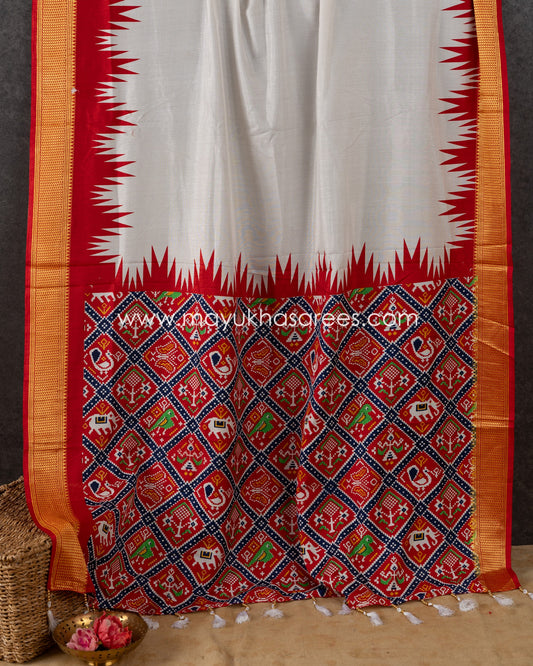 White & Red Patola Prints on Munga Silk Saree with Temple Design Borders and Stitched Blouse in Size 38 44