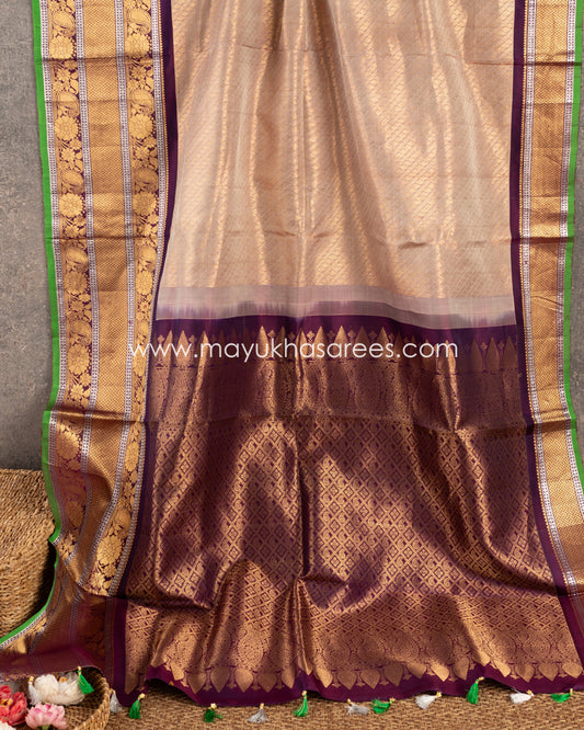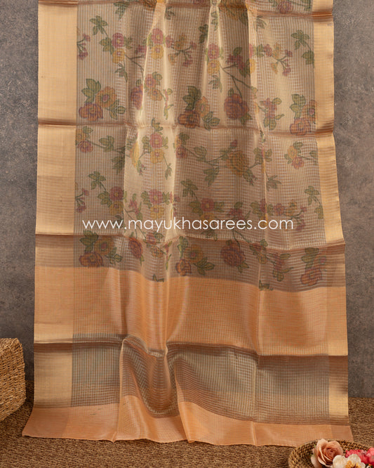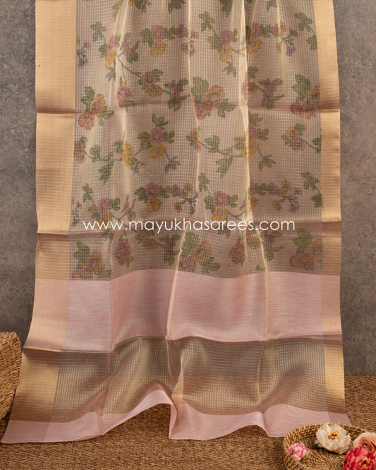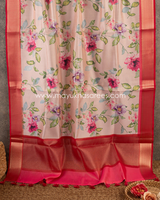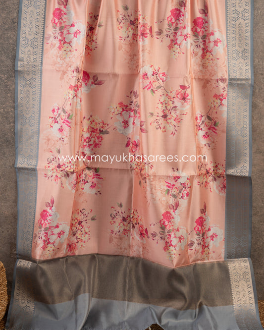 Peach Blossom Elegance: Tissue Tassar Banarasi Blend Saree, Floral Prints, Free Shipping And Stitched Blouse In Size 38-69