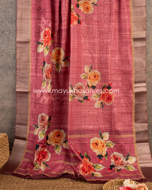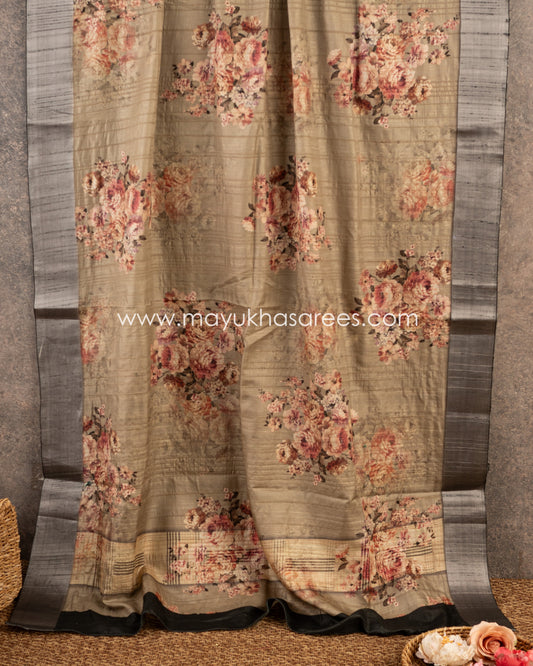 Opulent Florals: Tassar Banarasi Saree, Floral Prints, Free Shipping And Stitched Blouse In Size 38-64