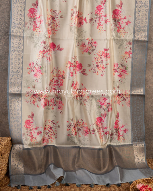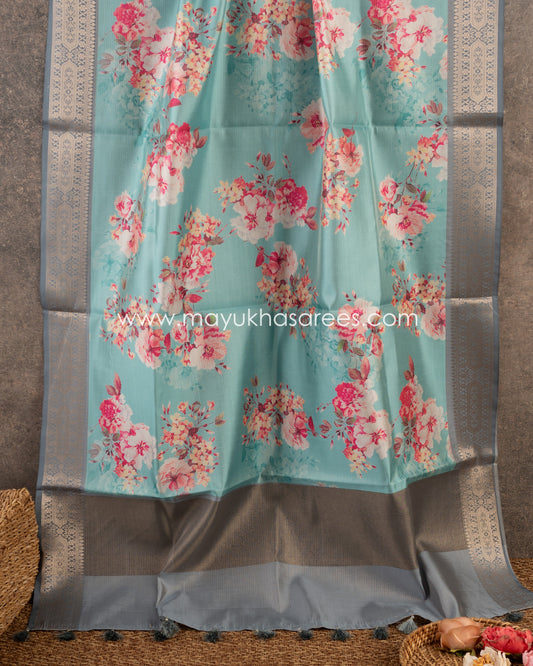 Serene Florals: Tassar Banarasi Blend Saree, Floral Prints, Free Shipping And Stitched Blouse In Size 38-65