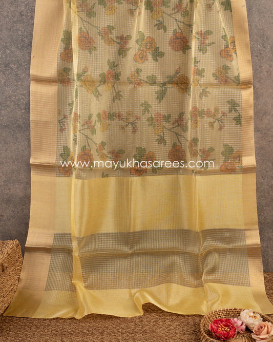 Regal Blooms: Tissue Tassar Banarasi Blend Saree, Floral Prints, Free Shipping And Stitched Blouse In Size 38-63