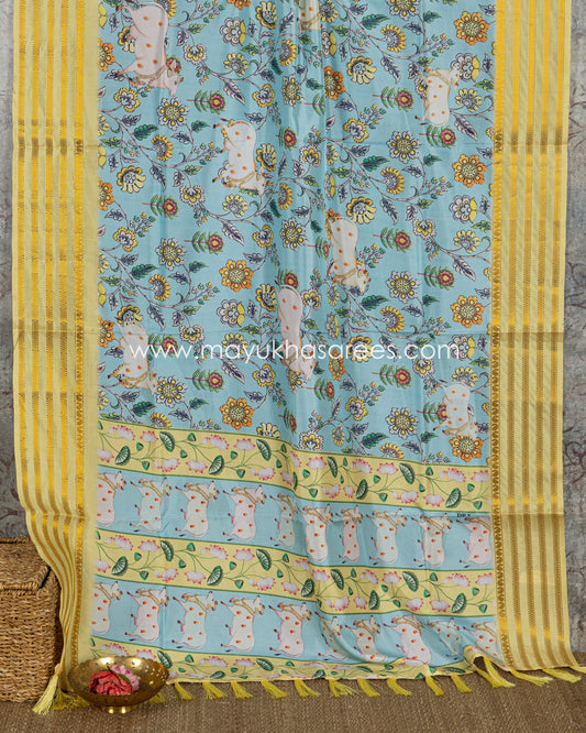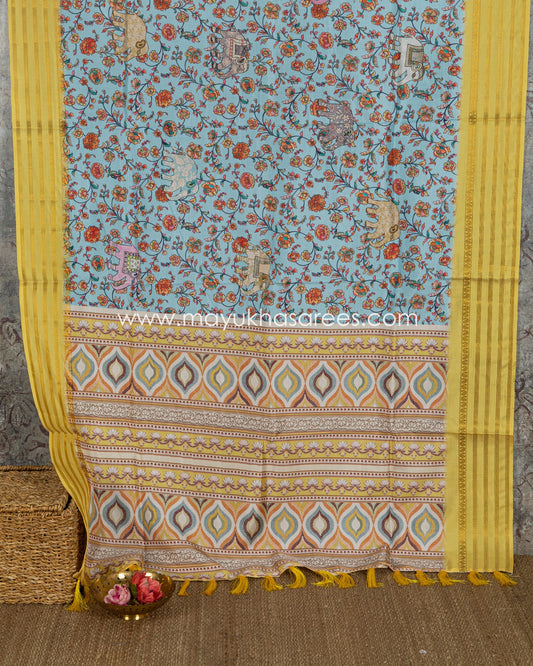 Blue and Yellow Dola Silk with Floral kalamkari and Pichwai Printed Saree with Blouse 38 44