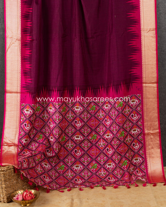 Wine & Pink Patola Prints on Munga Silk Saree with Temple Design Borders and Stitched Blouse in Size 38 44